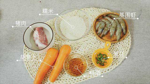 胡萝卜、基围虾、糯米,猪肉,葱花、料酒