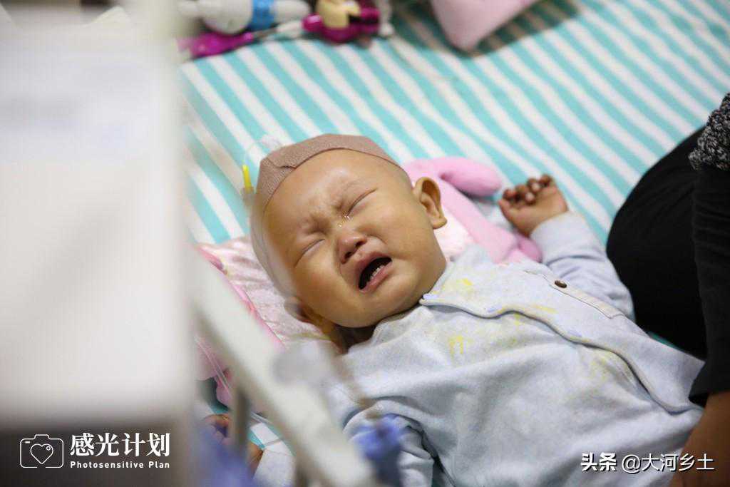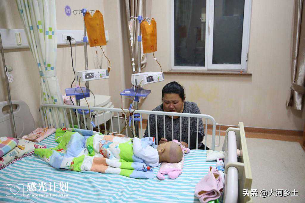 现在才18个月的小政勋本应在父母身边无忧无虑地成长,患病后只能每天呆在小小的病房里,不停地打针吃药,治疗期间的抽血化疗更让他小小的身体伤痕累累。看着来之不易的孩子躺在病床上遭受病痛折磨,夫妻俩无比心疼可又无能为力,只得天天在医院精心照顾,积极配合医生治疗。图为王美丽看着熟睡的孩子,想到未来艰难的治疗之路默默哭泣。