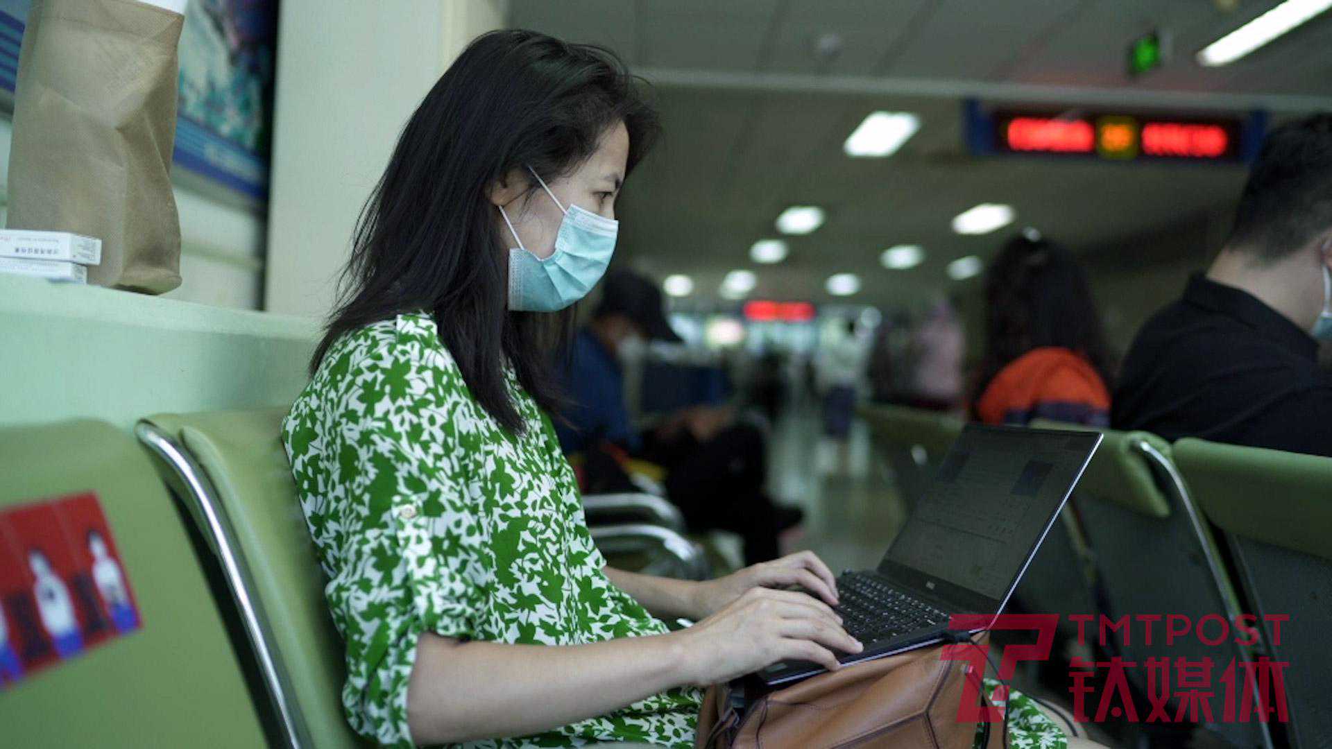 2022年6月24日,北京,张梦薇在医院候诊厅共工作。