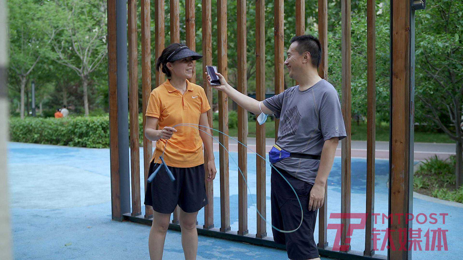 2022年6月9日,北京,张梦薇和丈夫在小区锻炼身体。