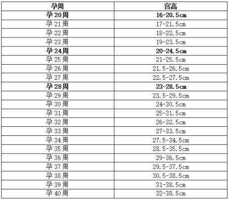 判断宫高是否正常的最简单标准就是,看是否和孕周相符,比如孕妇怀孕20周,那么宫高正常应在16-20cm之间。孕20-33周,宫高大约以每周0.8㎝-1cm的速度增长,孕33周之后,增长的速度变缓,每周约增长0.5㎝,具体对应的数值如下: