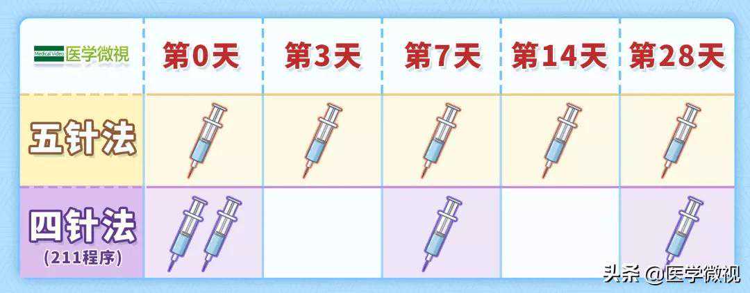 五针法:在暴露当天、第3天、第7天、第14天、第28天各打一针,一共五次五针。
