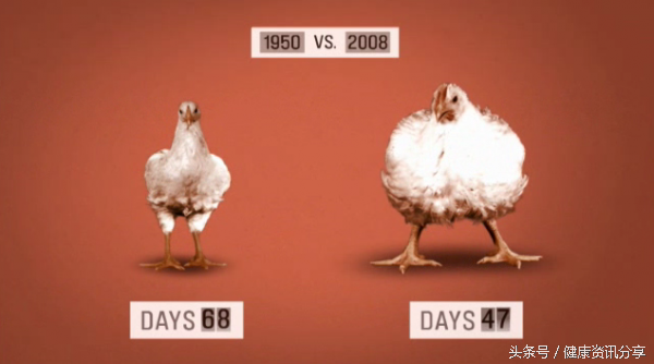 工业化养殖的动物用各种“工业”方法催肥,关在笼子里不能动,只长肉。如上图,2008年47天的鸡就比1950年天然养的68天的鸡肥很多。显然催肥的鸡作为食物更不健康。