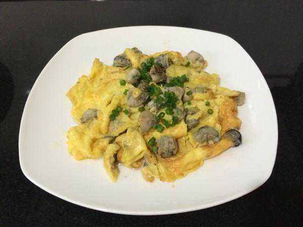 3、加入腌制好的牡蛎、少许食盐调味、搅拌好的蛋液,炒熟关火,出锅即可食用。
