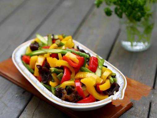2、热锅热油先下蒜,然后下芦笋、甜椒和木耳清炒。芦笋、甜椒和木耳受热程度是差不多的,不要分开炒;