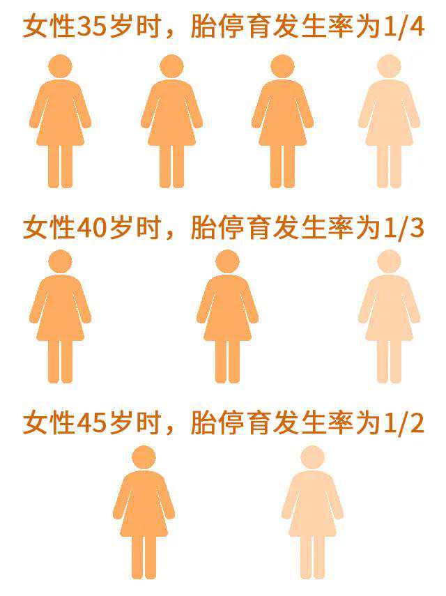 有研究证明,各年龄段女性发生自然流产的风险分别为:30岁以下(12%)、30~34(15%)、35~39(25%)、40~44岁(51%)以及45岁及以上(93%)。35岁以上女性发生胚胎染色体异常的风险增加3倍以上,而≥40岁以上女性是6倍。