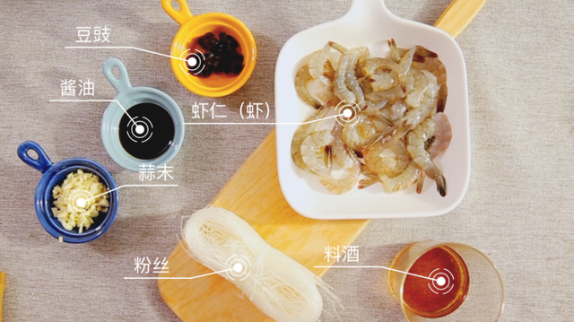 虾(适量)、粉丝一小撮、蒜末适量,豆豉适量、酱油适量、料酒适量