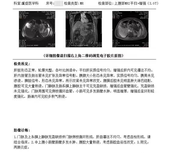 患者做出决定后,医师马上进行了相关检查。上腹部CT有了重要的发现:门静脉有血栓形成,加上小肠有局部水肿。且患者出现明显胸闷气促,有呼吸衰竭表现,这下也越发觉得问题的严重,因为妇儿医院相对比较专业,综合能力有欠缺,就请我们科王主任去会诊,并转来我院诊治。
